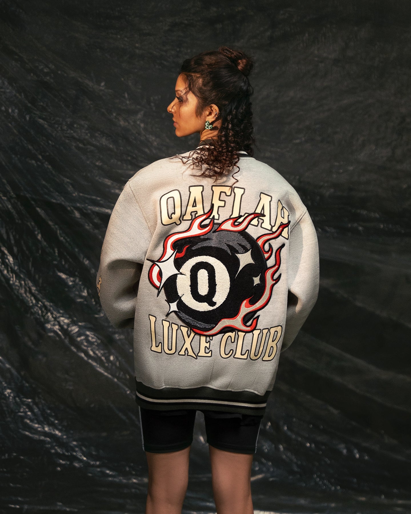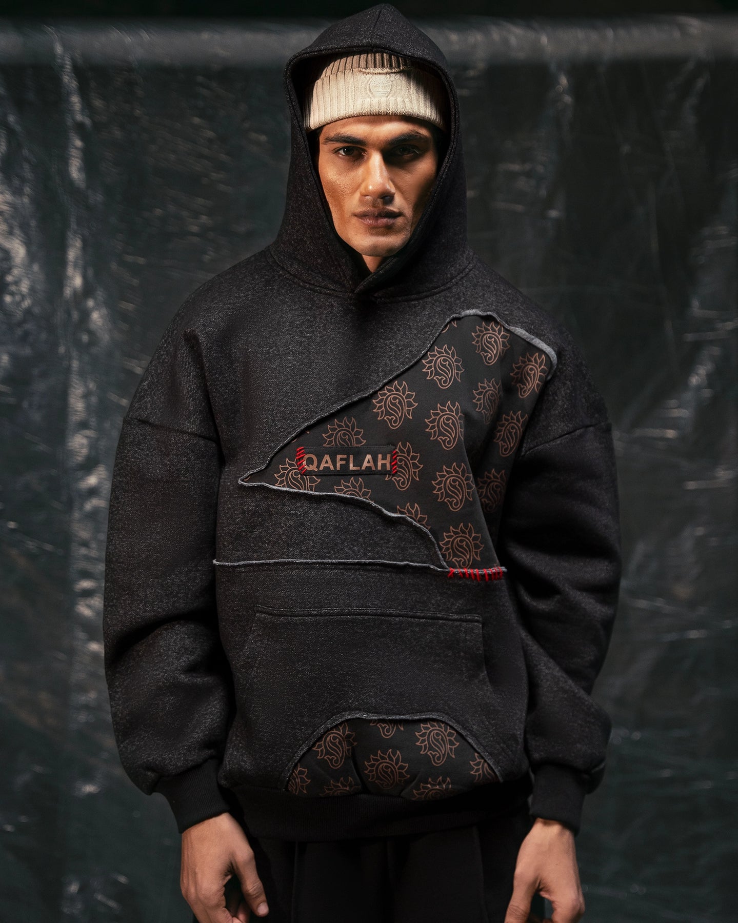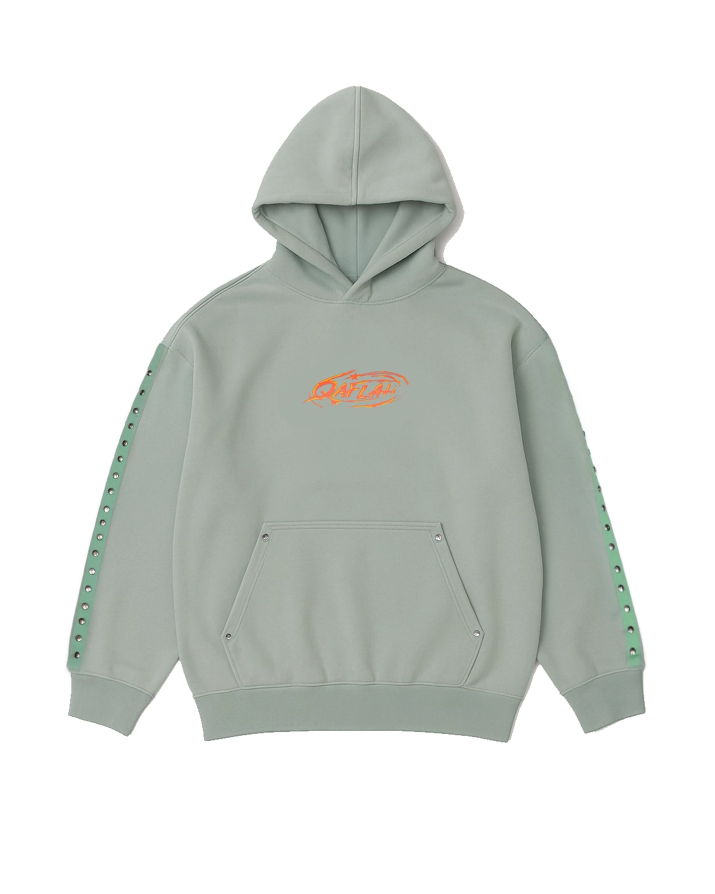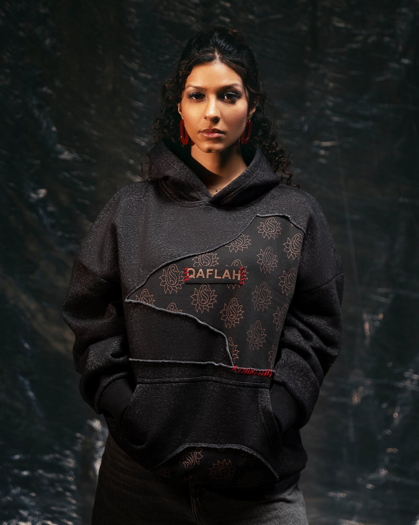 The front features a clean, screen-printed Qaflah logo, keeping the look minimal yet striking. Both sleeves are designed with lace panels embedded with metallic studs, adding a modern, edgy twist to the silhouette.