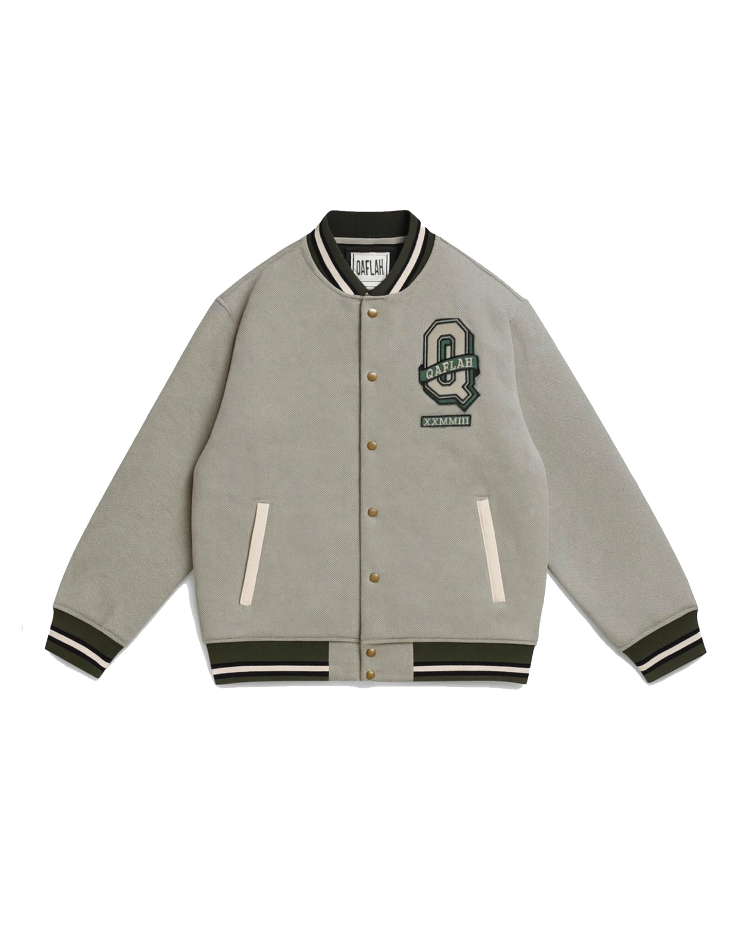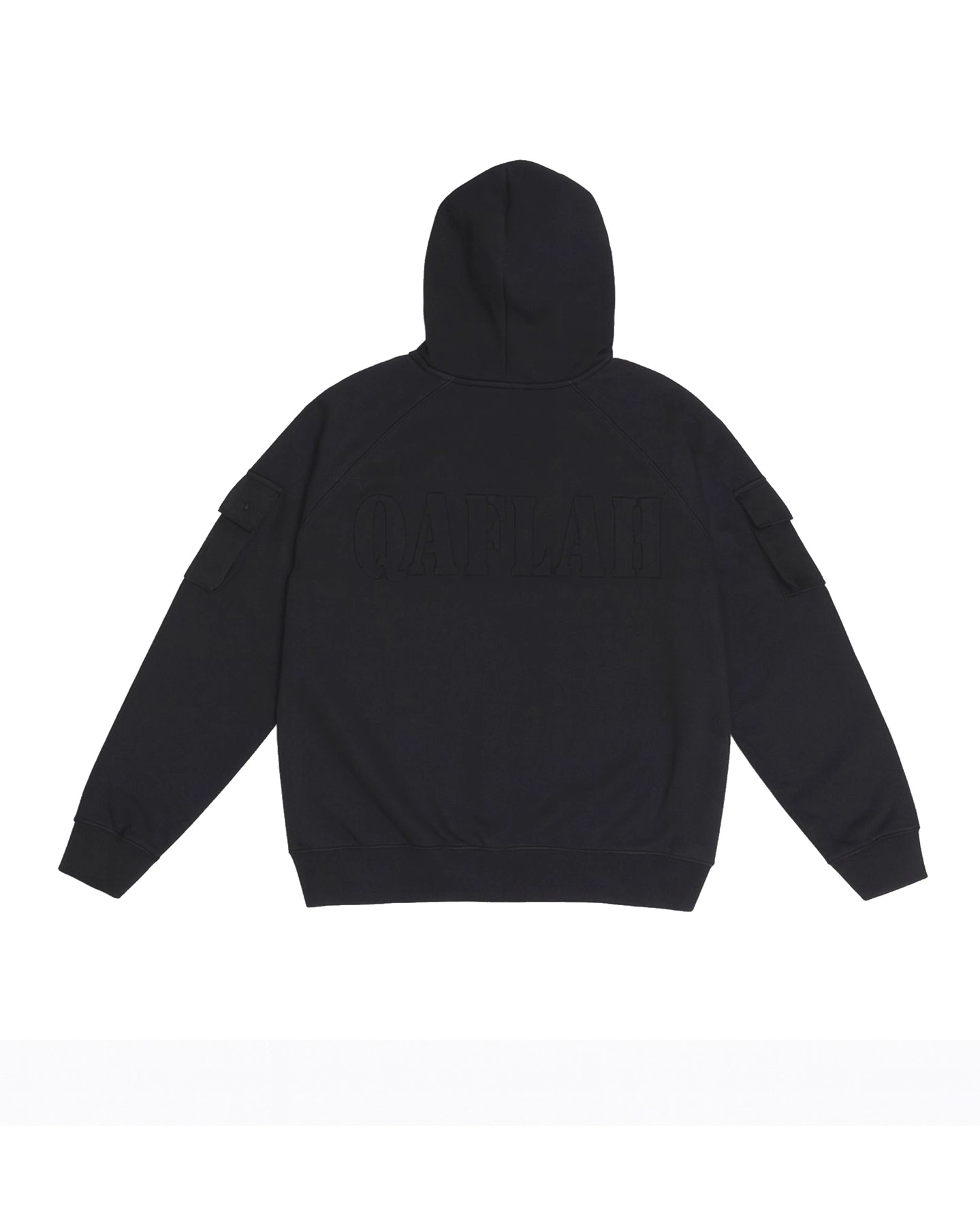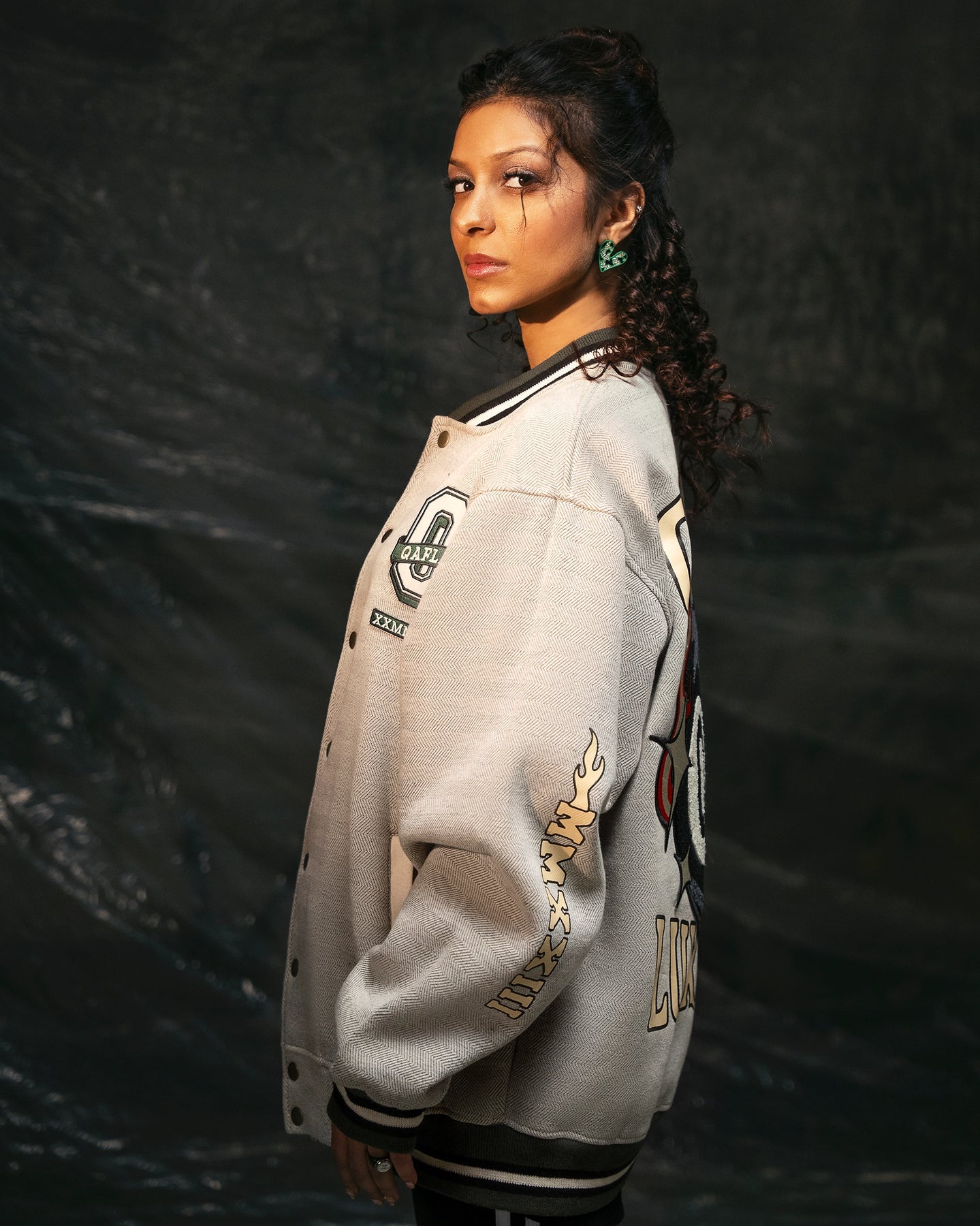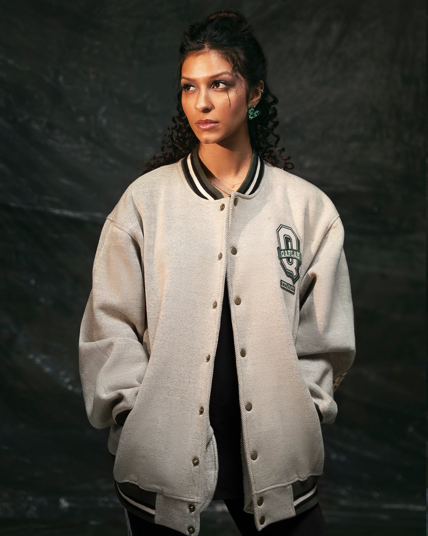 The front features a clean, screen-printed Qaflah logo, keeping the look minimal yet striking. Both sleeves are designed with lace panels embedded with metallic studs, adding a modern, edgy twist to the silhouette.