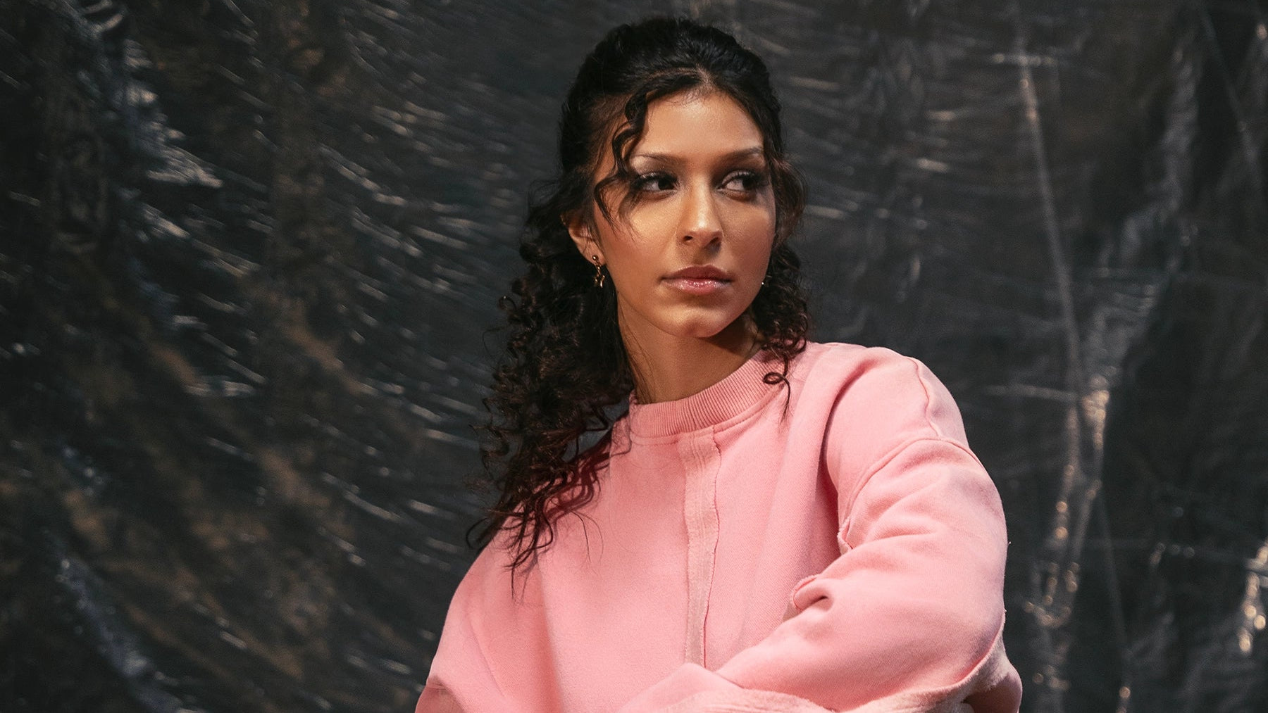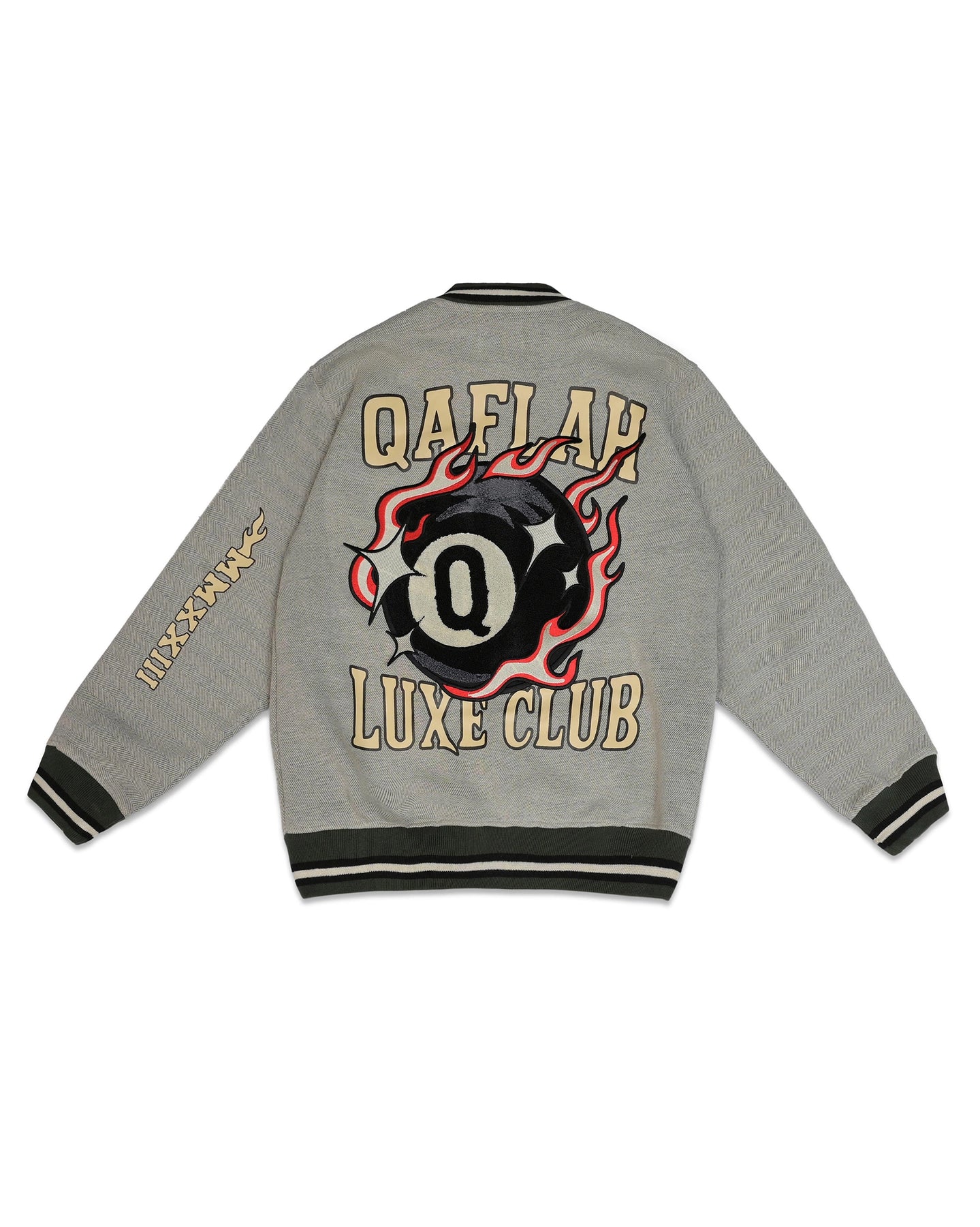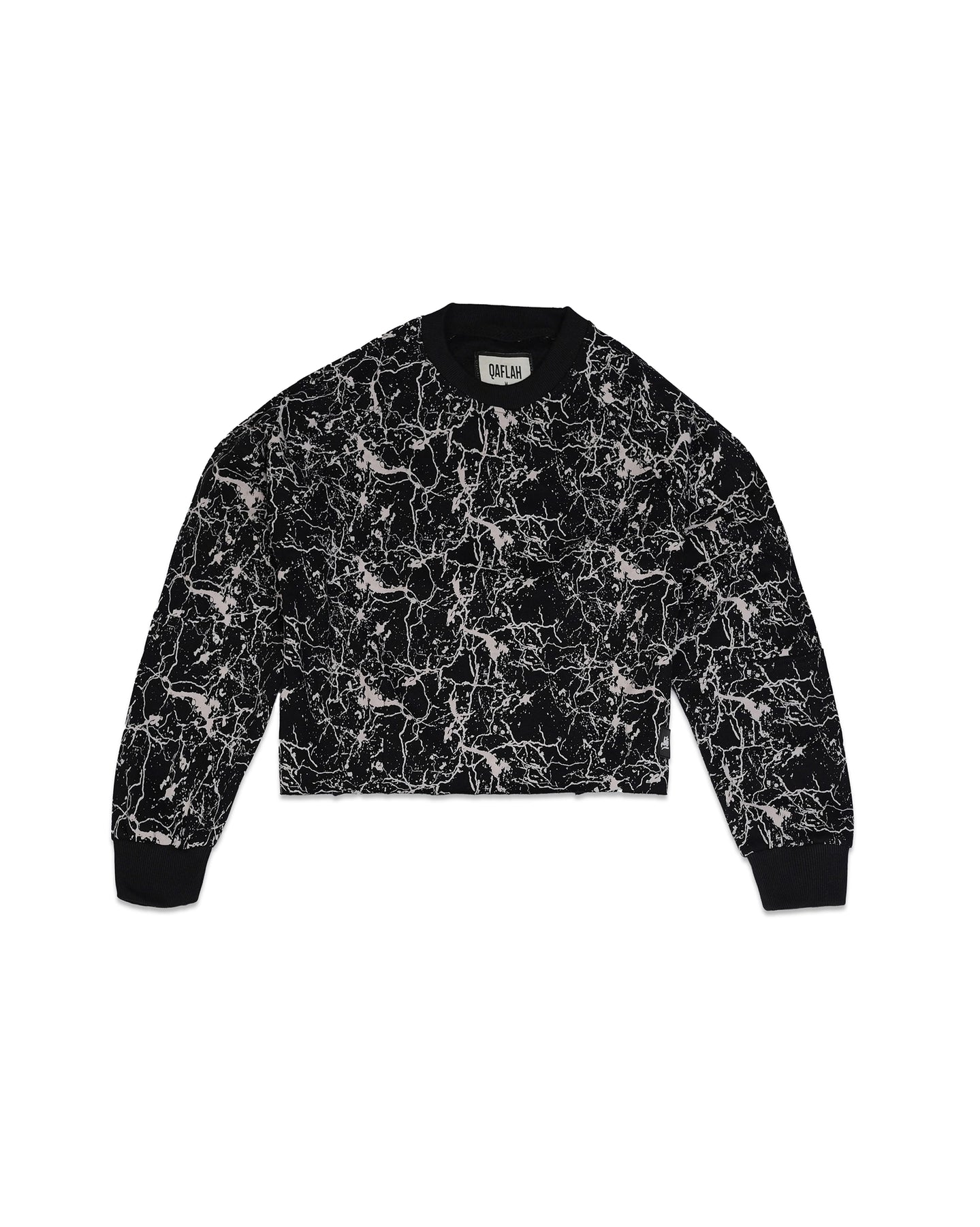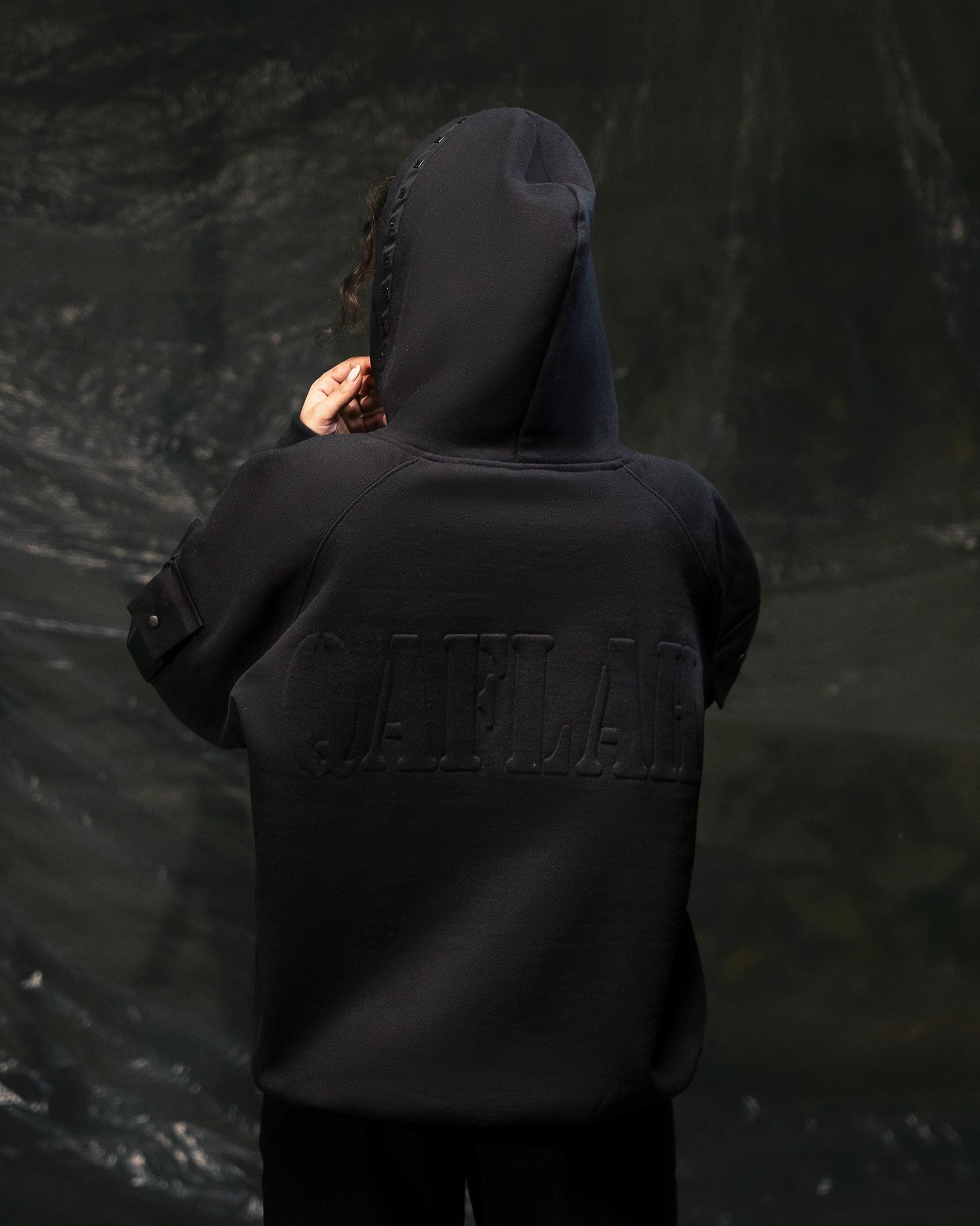 The front features a clean, screen-printed Qaflah logo, keeping the look minimal yet striking. Both sleeves are designed with lace panels embedded with metallic studs, adding a modern, edgy twist to the silhouette.