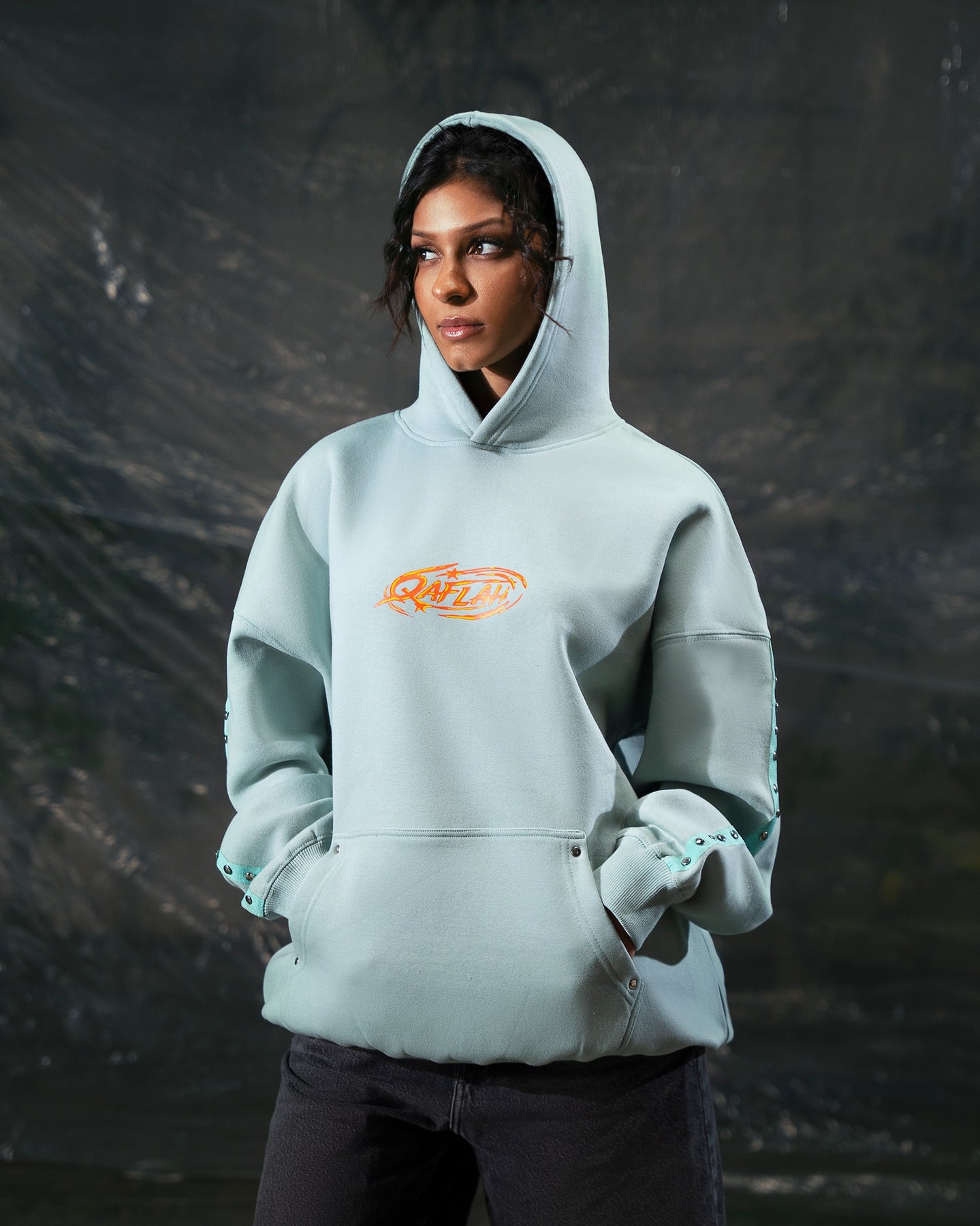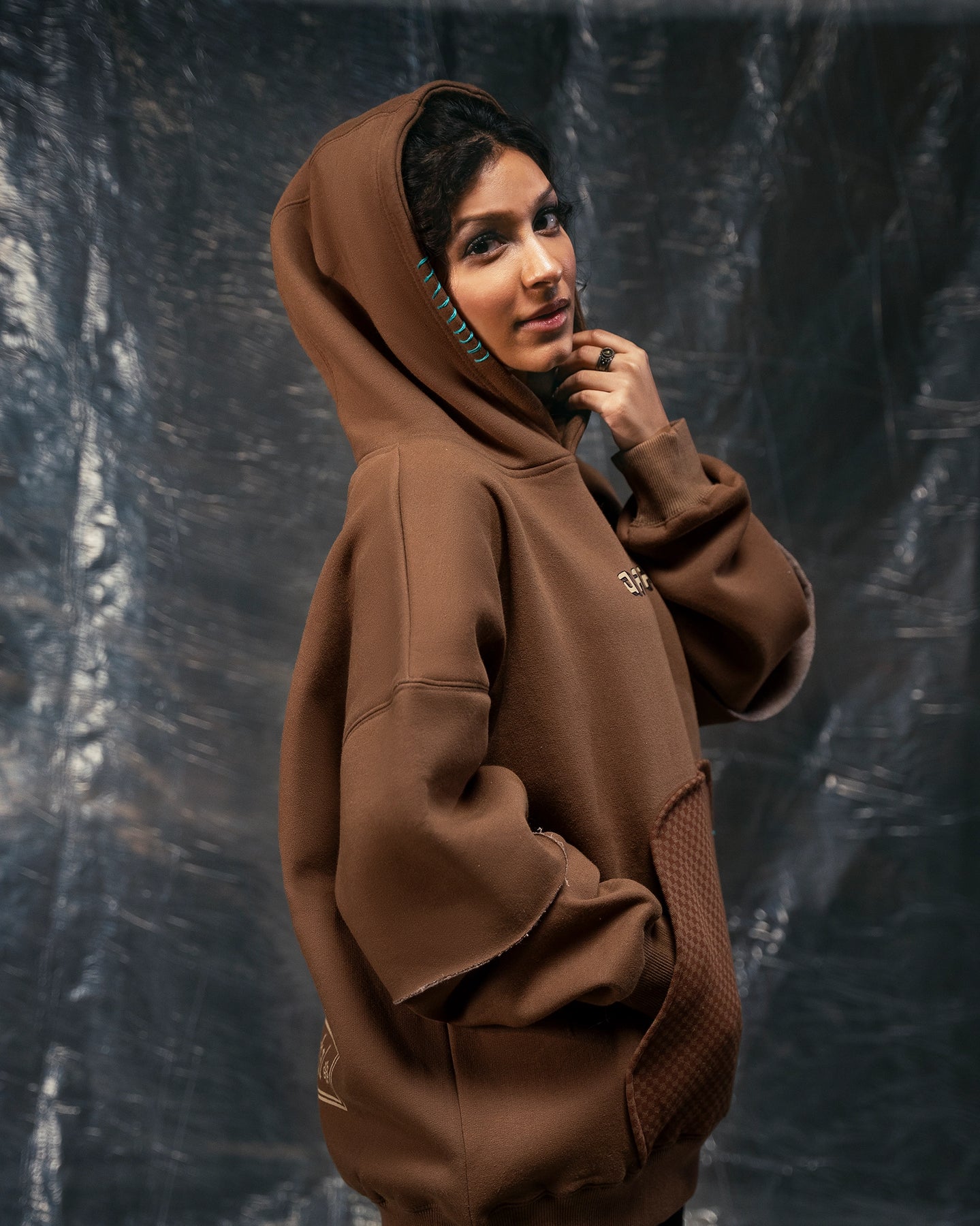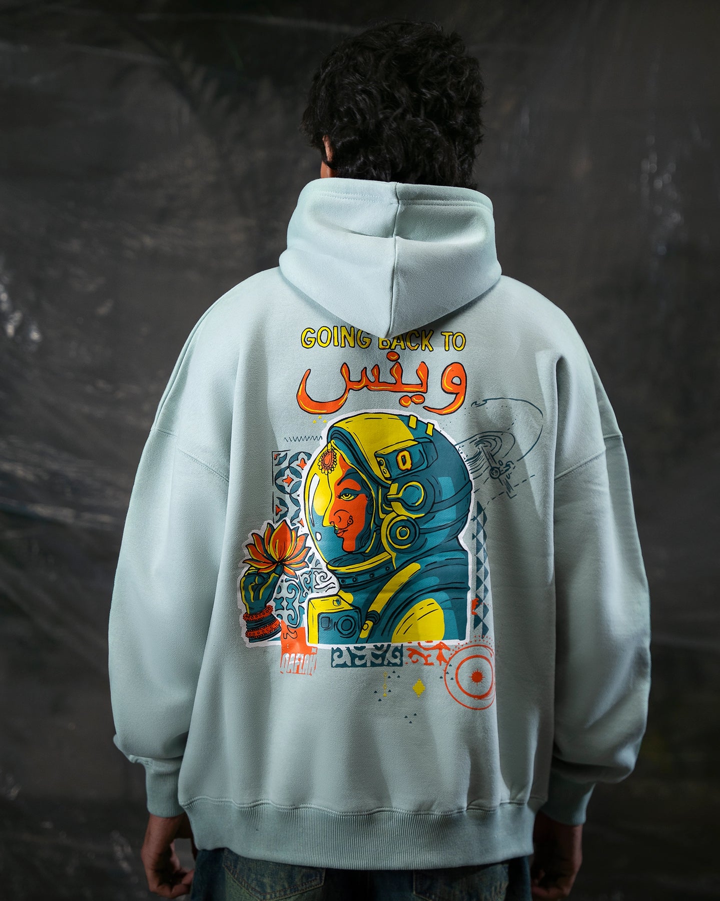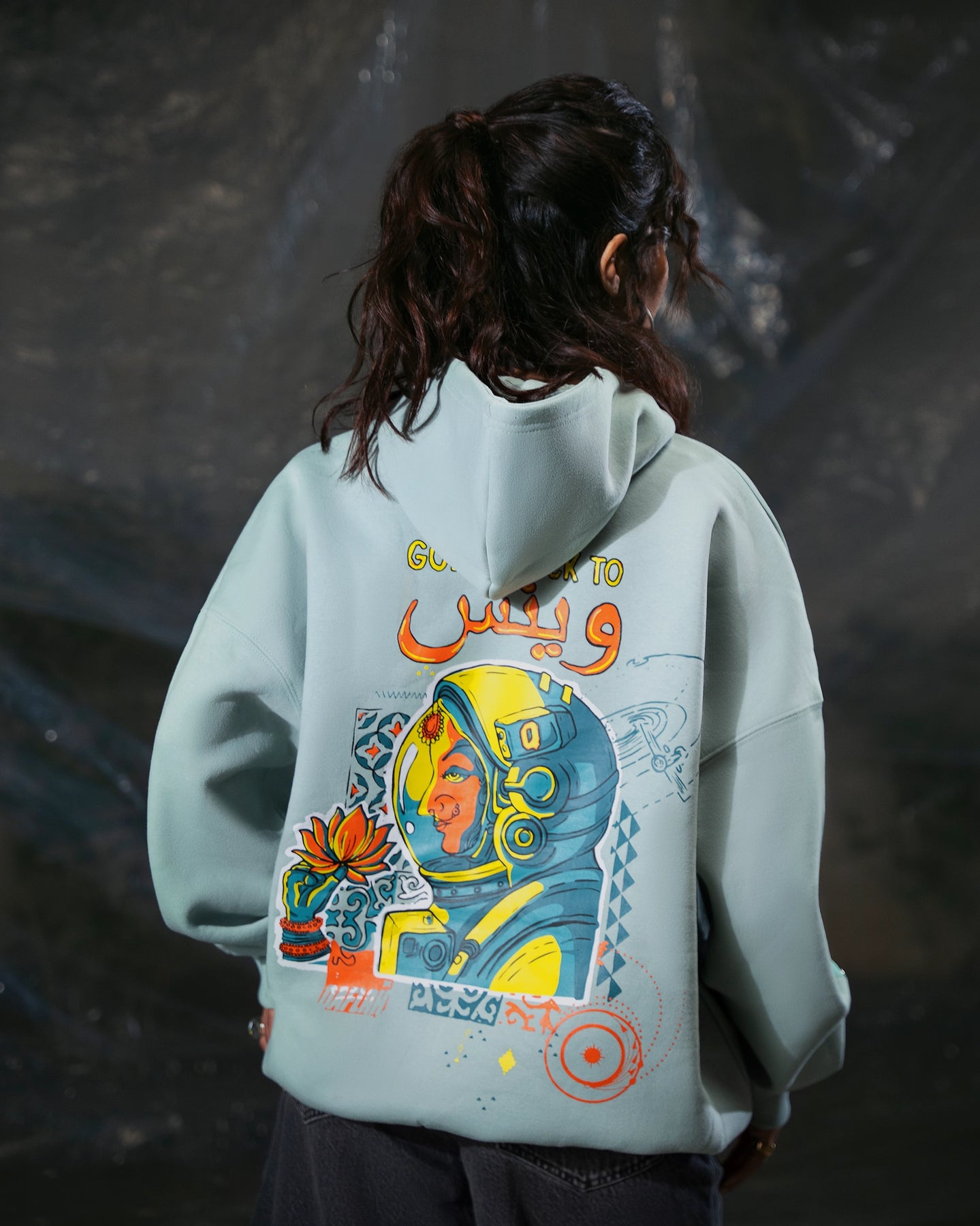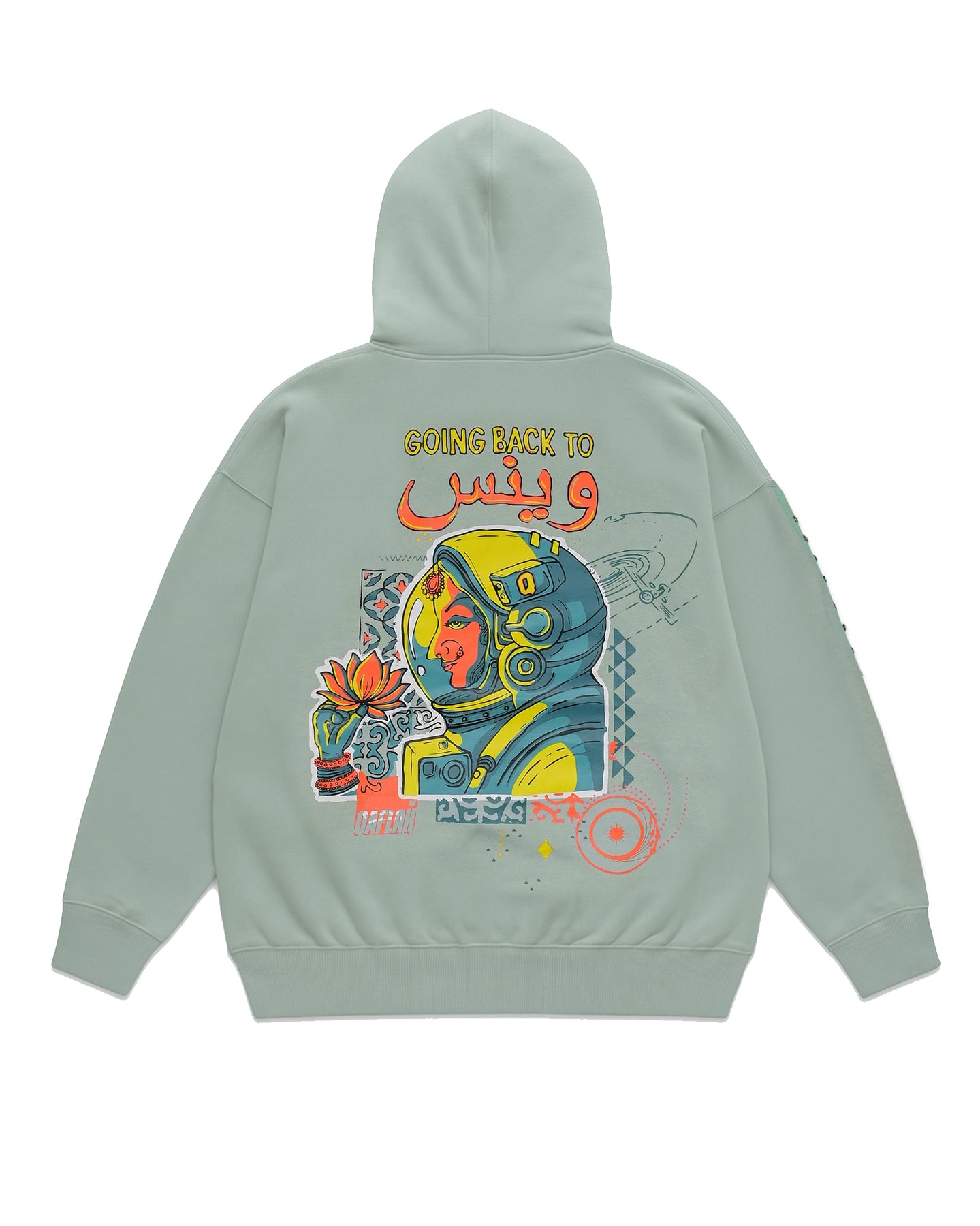 The Going Back to Venus Hoodie is a bold fusion of futuristic storytelling and South Asian visual culture, crafted for those who love statement pieces with meaning. Made in a soft sage tone, this hoodie stands out through its vibrant artwork and unique construction details.